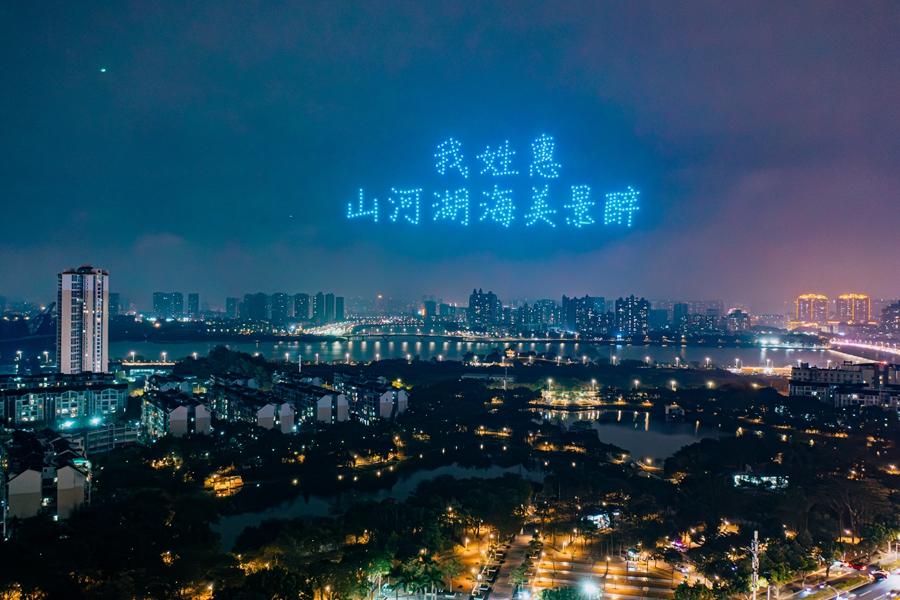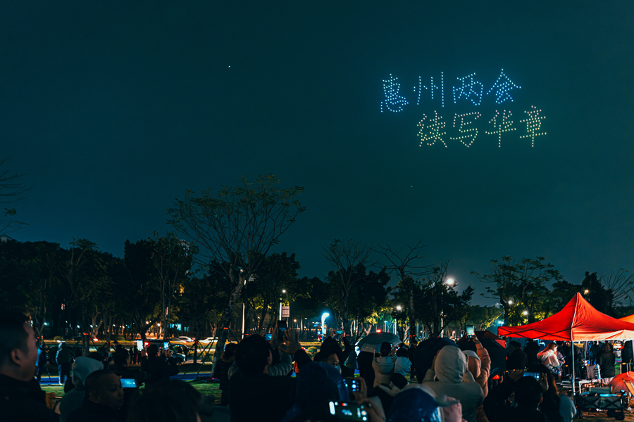 無(wú)人機(jī)璀璨起舞,拼出“惠州兩會(huì),續(xù)寫(xiě)華章”字樣。
