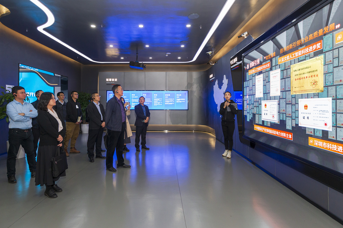 惠州市數(shù)字文化產(chǎn)業(yè)協(xié)會(huì)走訪調(diào)研團(tuán)聽(tīng)取工作人員對(duì)云天勵(lì)飛的介紹。