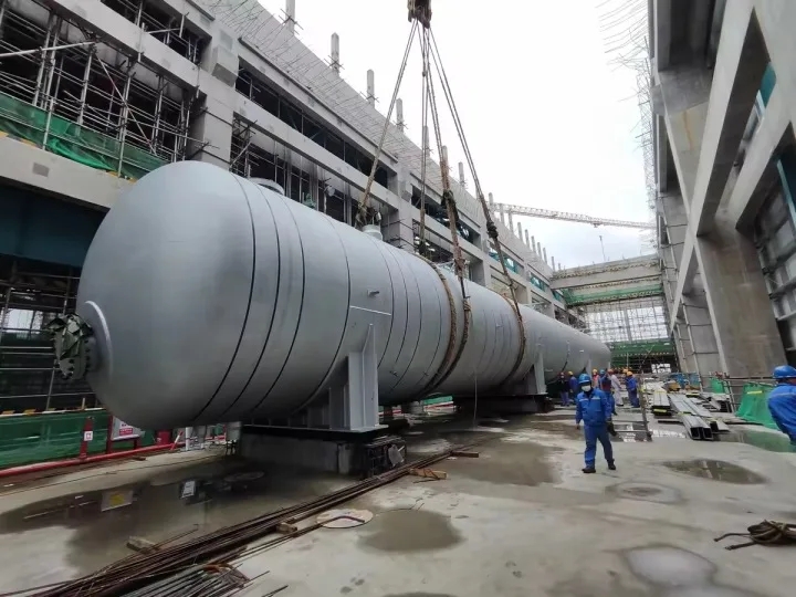 除氧器是整個(gè)核電設(shè)備中最長的容器設(shè)備,總長約46米,總重量約220噸。