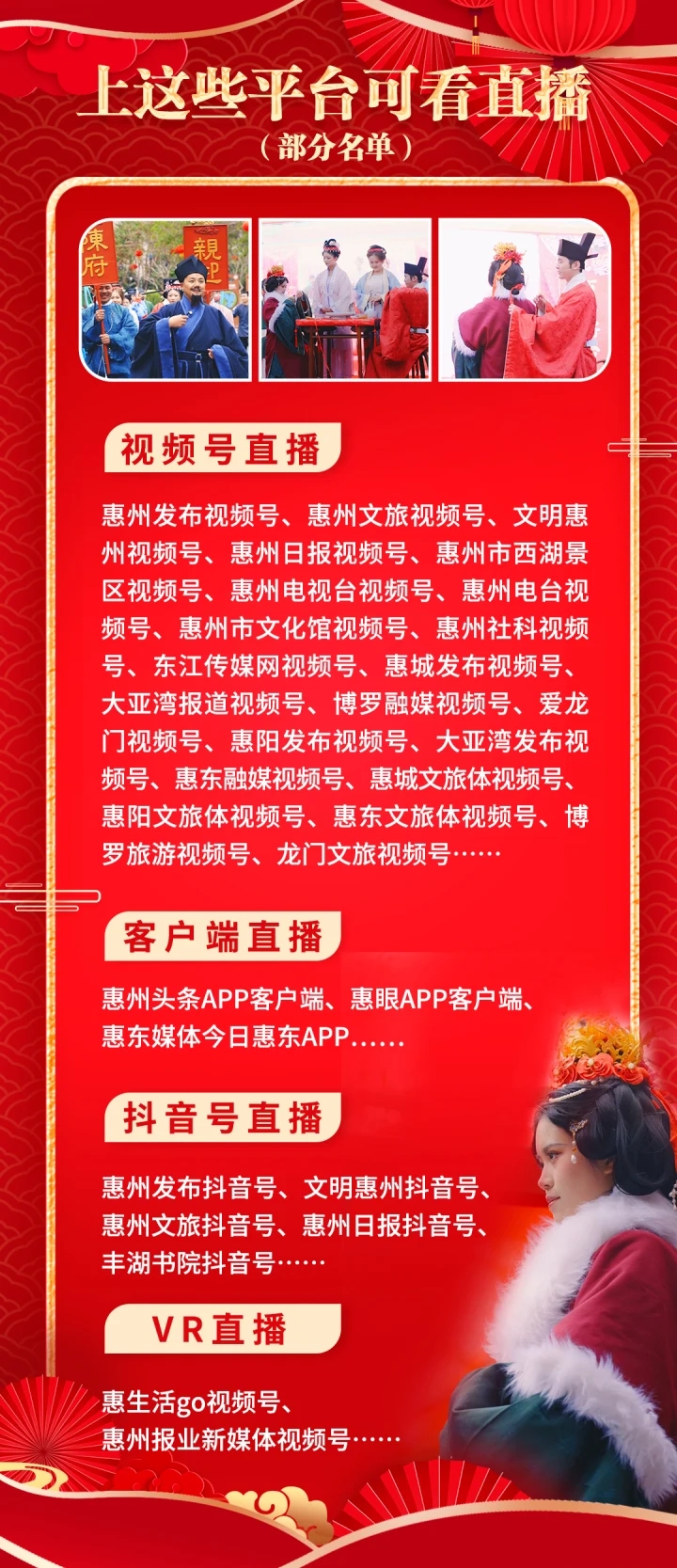 今日是農(nóng)歷大年初三,上午10:00至11:20,惠州西湖將繼續(xù)上演精彩的宋式婚禮秀。現(xiàn)場(chǎng),“蘇東坡”作為婚禮主持人,帶市民和游客近距離體驗(yàn)一場(chǎng)原汁原味的宋式婚禮。屆時(shí),將有40多個(gè)新媒體平臺(tái)進(jìn)行現(xiàn)場(chǎng)直播。