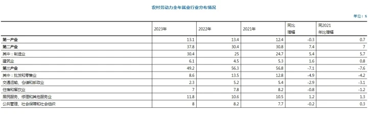 從農(nóng)村勞動力全年從事主要職業(yè)分布數(shù)據(jù)看,2023年新產(chǎn)業(yè)、新業(yè)態(tài)、新商業(yè)模式就業(yè)占比達到67.3%,同比增長2.5個百分點,其中,新生代農(nóng)村勞動力占比55.5%。
