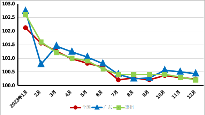 調(diào)查數(shù)據(jù)顯示,分月來看,2023年惠州CPI同比走勢與全國、全省基本一致。2023年全年,惠州CPI較2022年上漲0.2%,和全國平均水平持平,比全省平均水平略低0.2個百分點,在全省21個地級以上市中,按漲跌幅從高到低排序,惠州居全省第8位。