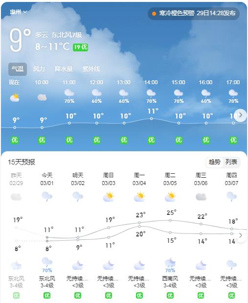 惠州日報訊 (記者劉建威)惠州市氣象臺2月29日14時25分將惠城區(qū)、仲愷高新區(qū)和大亞灣開發(fā)區(qū)寒冷黃色預(yù)警信號升級為橙色。記者了解到,其余縣(區(qū))寒冷預(yù)警信號也相繼升級為橙色。