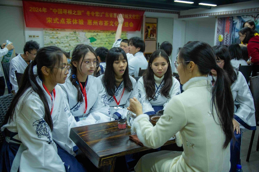 2月26日下午1時(shí),惠州市優(yōu)茶集茶葉審評(píng)中心,來了一群身著漢服的學(xué)生。他們是2024年“中國尋根之旅”冬令營(廣東省惠州傳統(tǒng)文化營)的學(xué)生,都是來自馬來西亞。在高級(jí)點(diǎn)茶師的指導(dǎo)下,他們了解中國茶和宋式點(diǎn)茶的歷史,品嘗點(diǎn)茶,并且親身體驗(yàn)了一番宋式點(diǎn)茶。