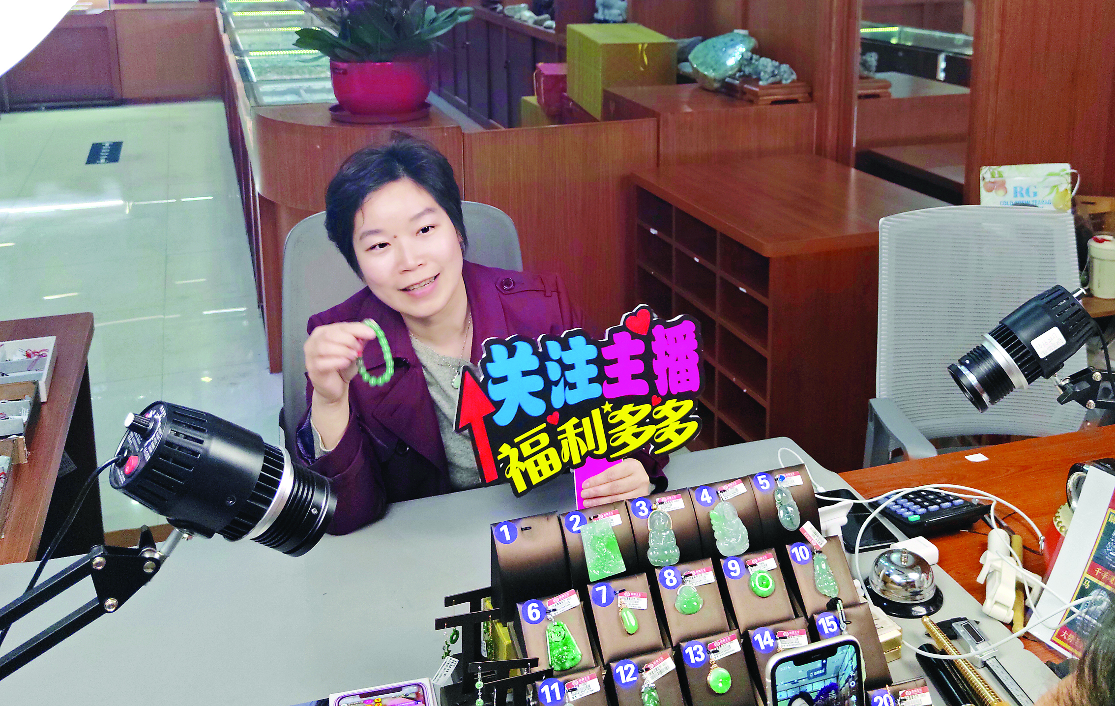 功夫不負(fù)有心人。目前南寶玉器多個(gè)直播賬號(hào)粉絲共有10多萬(wàn)人,線上銷售越來(lái)越好。在黃愷妍的帶領(lǐng)下,2023年南寶玉寶翡翠銷售額比2022年增加一倍,其中直播銷售就占了60%。