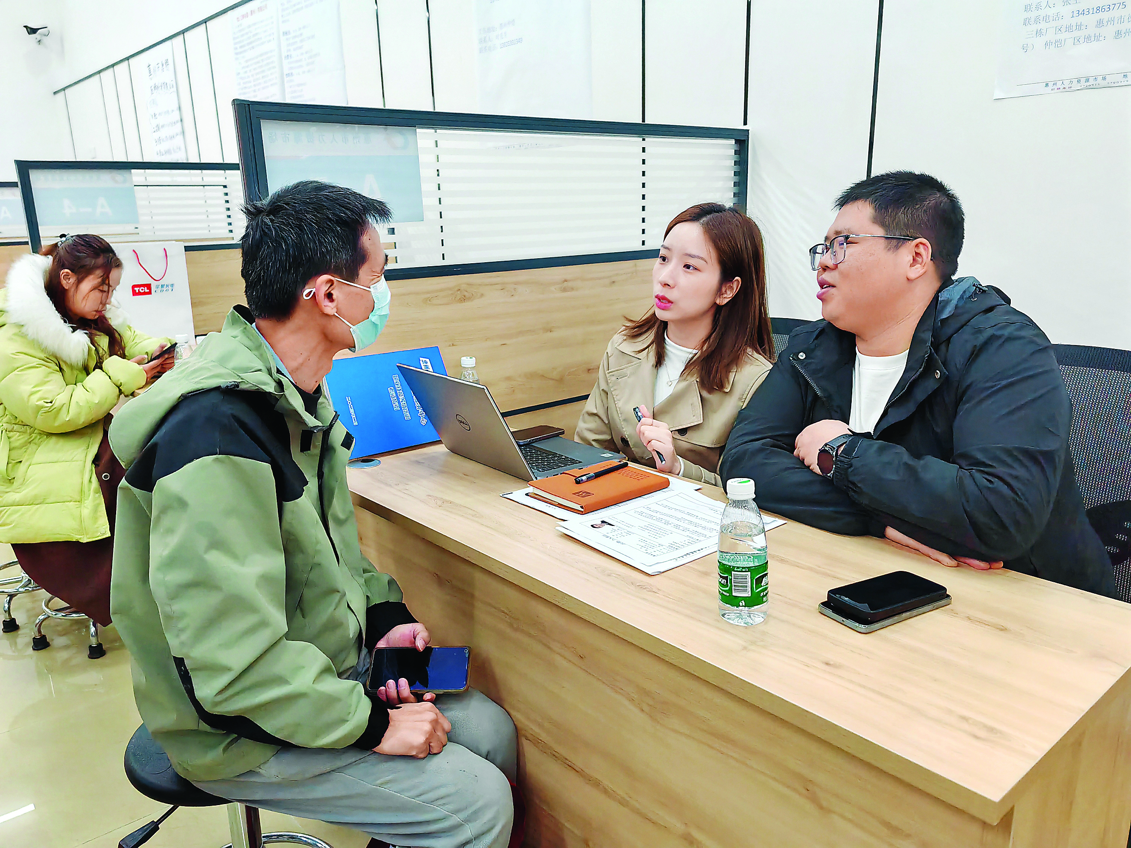 “春節(jié)開工后,企業(yè)訂單比較穩(wěn)定,目前普工缺口300人左右,還有質(zhì)檢員崗位5名,技術(shù)崗位也有一定的缺口。”惠州市德賽電池有限公司人事文員張先生表示,當(dāng)天招聘效果還不錯(cuò),下一步將安排進(jìn)一步面試。