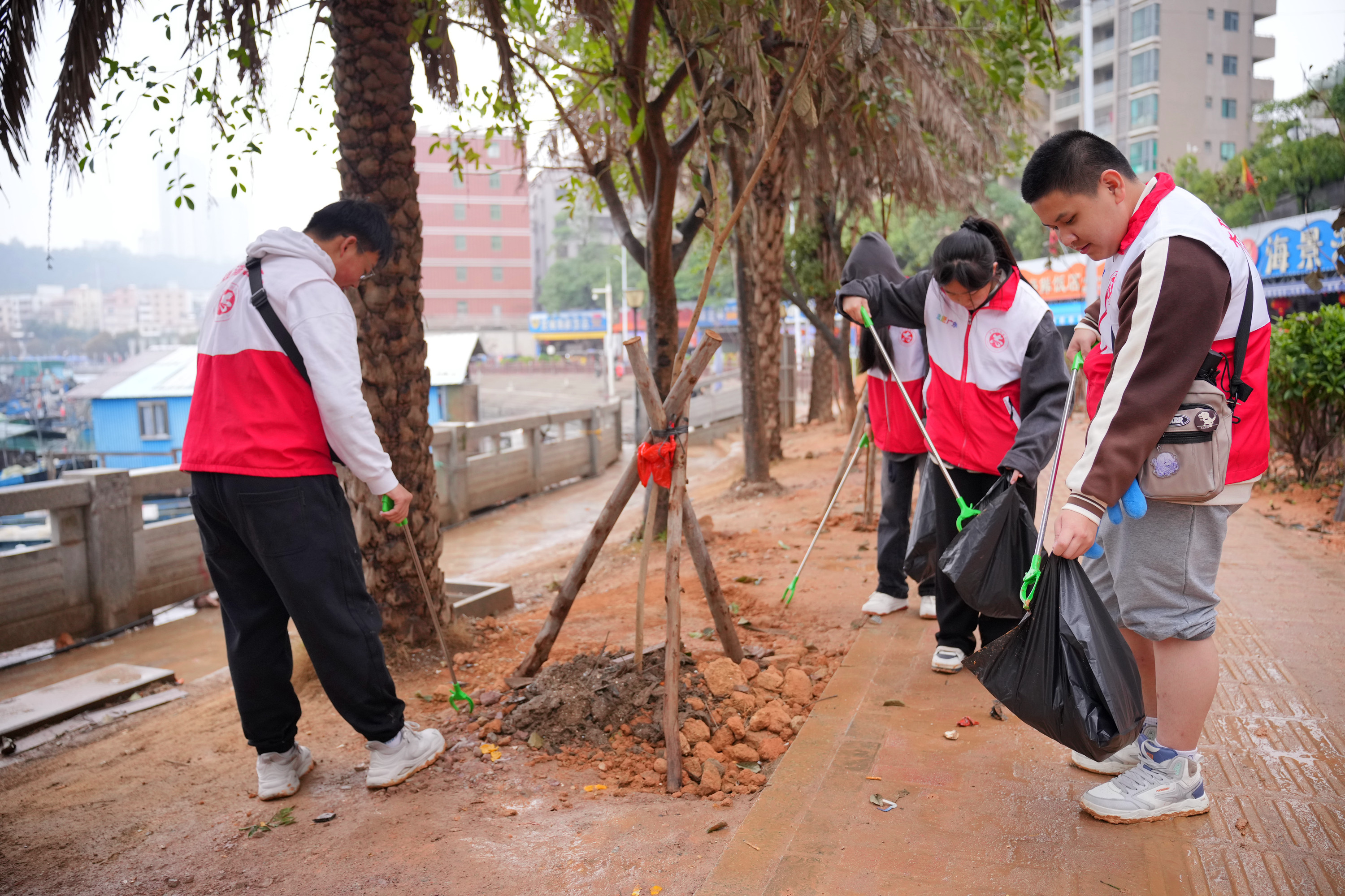 志愿者手拿垃圾鉗、垃圾袋參加添綠撿跑志愿服務(wù)活動。惠州日報記者周楠 攝