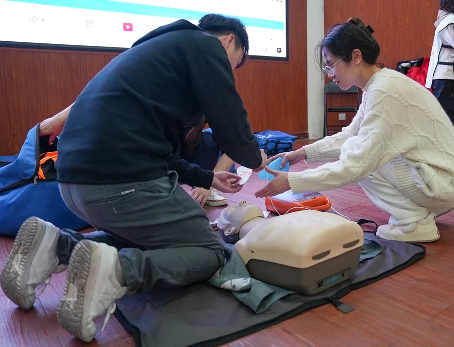 參與培訓(xùn)的醫(yī)療保障人員正在學(xué)習(xí)如何正確使用AED進(jìn)行急救。