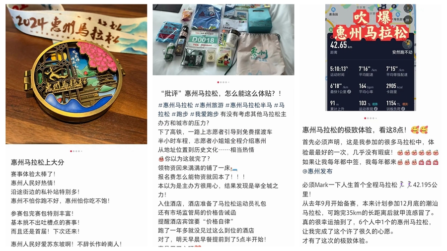不少參賽選手在各大社交媒體上表揚惠州的用心服務,“惠州馬拉松贏麻了,組委會安排免費半日游,以后‘惠馬’我都報。”“惠州馬拉松上大分,惠州人民好熱情,沿途補給站特別多,惠州不怕你跑不好,就怕你吃不飽!”“參賽包、完賽包特別豐富,挑不出槽點,下次還來!”……