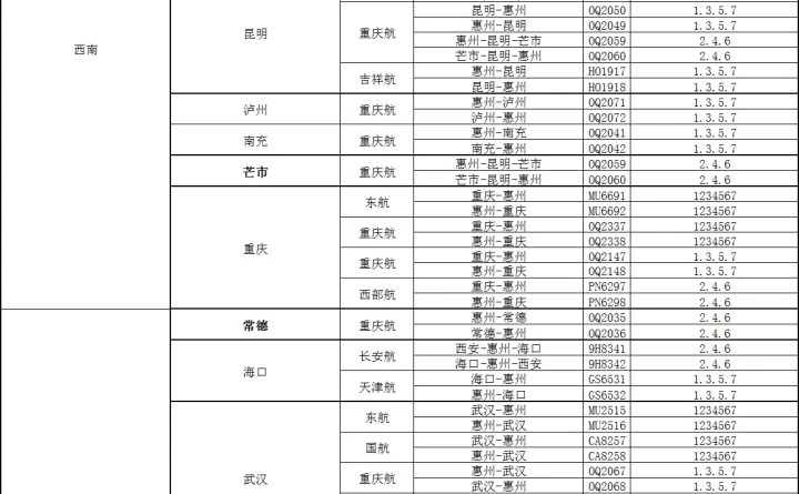 (5)昆明:每天2班,周1357每天最高可達(dá)到3班