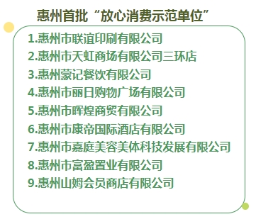 為進(jìn)一步推進(jìn)放心消費(fèi)“雙承諾”單位的建設(shè),著力打造經(jīng)營規(guī)范有序、消費(fèi)安全滿意的放心消費(fèi)環(huán)境,惠州市消費(fèi)者權(quán)益保護(hù)委員會(huì)組織開展了全市首批“放心消費(fèi)示范單位”選樹活動(dòng)。在啟動(dòng)儀式上,惠州市消費(fèi)者權(quán)益保護(hù)委員會(huì)發(fā)布了惠州首批“放心消費(fèi)示范單位”名單,并為這9家企業(yè)單位頒發(fā)了標(biāo)牌。