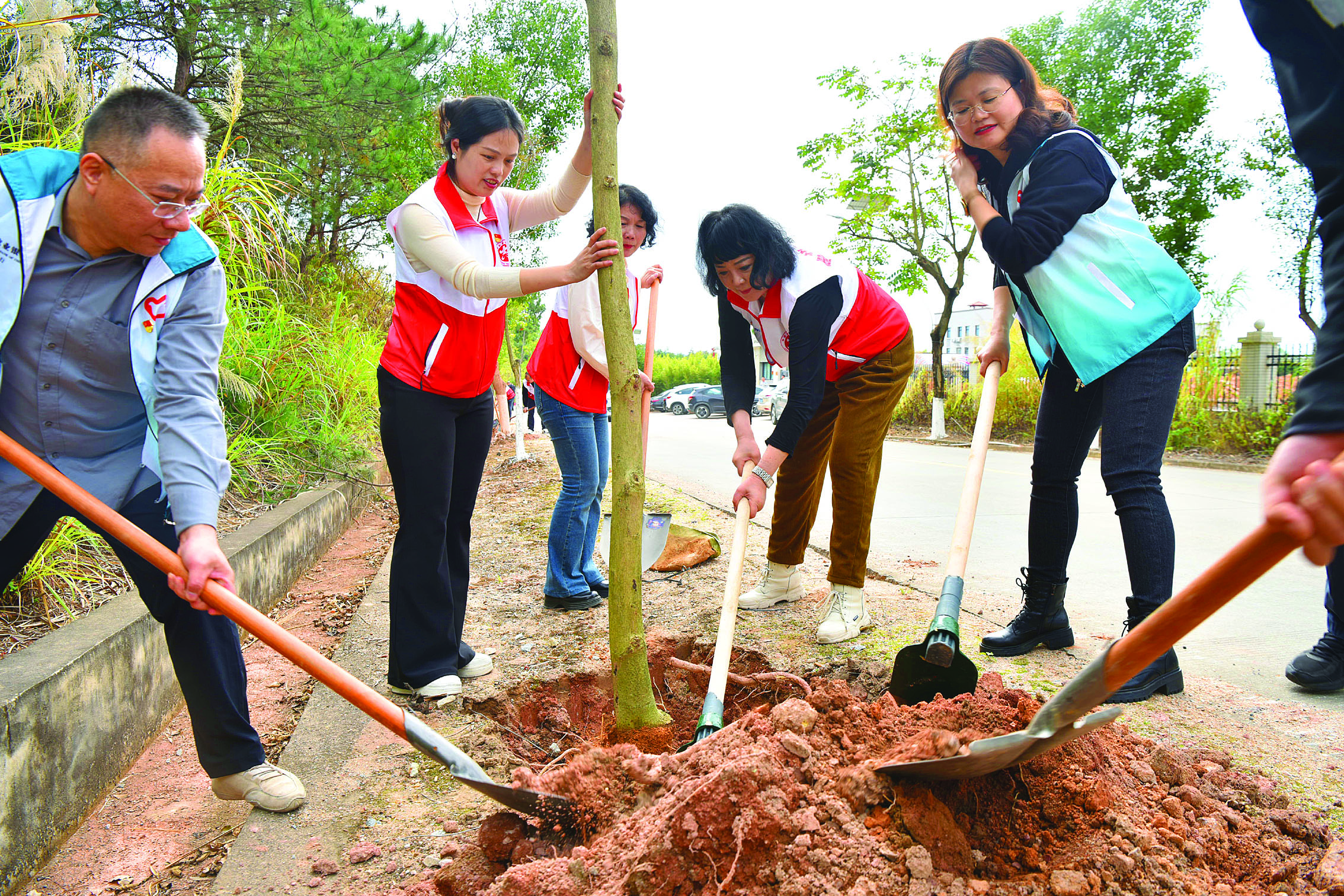 植樹志愿者揮鍬鏟土、扶苗培土、圍堰澆水。