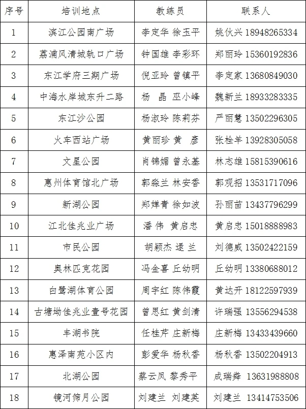 惠州日?qǐng)?bào)訊 (記者龔妍 譚琳 通訊員劉澤華)記者日前從市文廣旅體局獲悉,惠州市第二十四屆太極拳活動(dòng)月即將啟動(dòng),4月1日至30日期間,市太極拳協(xié)會(huì)將在全市設(shè)置18個(gè)教學(xué)點(diǎn),免費(fèi)為市民傳授國(guó)家體育總局編制的24式太極拳、健身氣功一套。活動(dòng)時(shí)間為每天早上7時(shí)至8時(shí)30分,感興趣的市民可報(bào)名參與(培訓(xùn)地點(diǎn)和聯(lián)系方式見表格)。