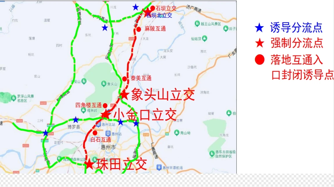 同時,經廣惠高速小金口樞紐互通上高速往河源方向的車輛,可通過惠州大道—金羅路—金龍大道從廣惠高速金龍收費站上高速繞行;往深圳方向的車輛,可通過惠州大道—小金河大道從長深高速惠州北收費站上高速繞行。高接高北往南方向的車輛,可通過廣河高速、汕湛高速、惠龍高速、新博高速、廣龍高速、廣惠高速通行。高接高南往北方向的車輛,可通過廣龍高速、廣惠高速、武深高速、惠龍高速、廣河高速、汕湛高速通行。