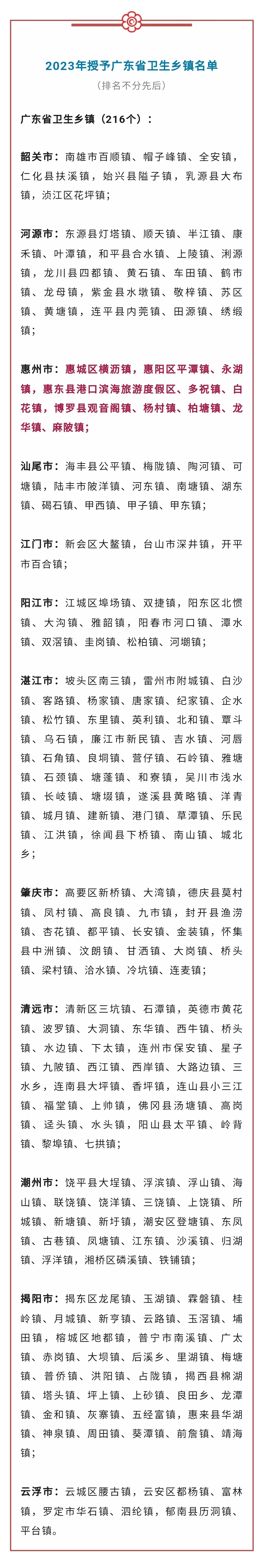 經(jīng)評審和復核,廣東省愛國衛(wèi)生運動委員會決定,授予韶關南雄市百順鎮(zhèn)等216個鎮(zhèn)“廣東省衛(wèi)生鄉(xiāng)鎮(zhèn)”榮譽稱號,并向以上單位頒發(fā)獎牌,以資鼓勵。其中惠州市惠城區(qū)橫瀝鎮(zhèn),惠陽區(qū)平潭鎮(zhèn)、永湖鎮(zhèn),惠東縣港口濱海旅游度假區(qū)、多祝鎮(zhèn)、白花鎮(zhèn),博羅縣觀音閣鎮(zhèn)、楊村鎮(zhèn)、柏塘鎮(zhèn)、龍華鎮(zhèn)、麻陂鎮(zhèn)榜上有名。