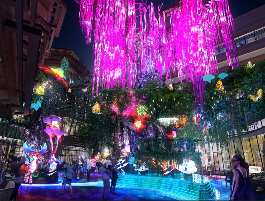以港惠三期重點(diǎn)打造的情景式主題街區(qū)“蝶樹溪谷”為例,蝶樹溪谷以葛洪遺衣化蝶的傳說為線索,營造出如夢如幻的羅浮意境空間,溪谷內(nèi)五大神樹齊聚,奇花異草、發(fā)光植物以此為家,動植物精靈在此自由自在地嬉戲玩耍,呈現(xiàn)出一個生機(jī)盎然、唯美夢幻的生態(tài)溪谷場景。