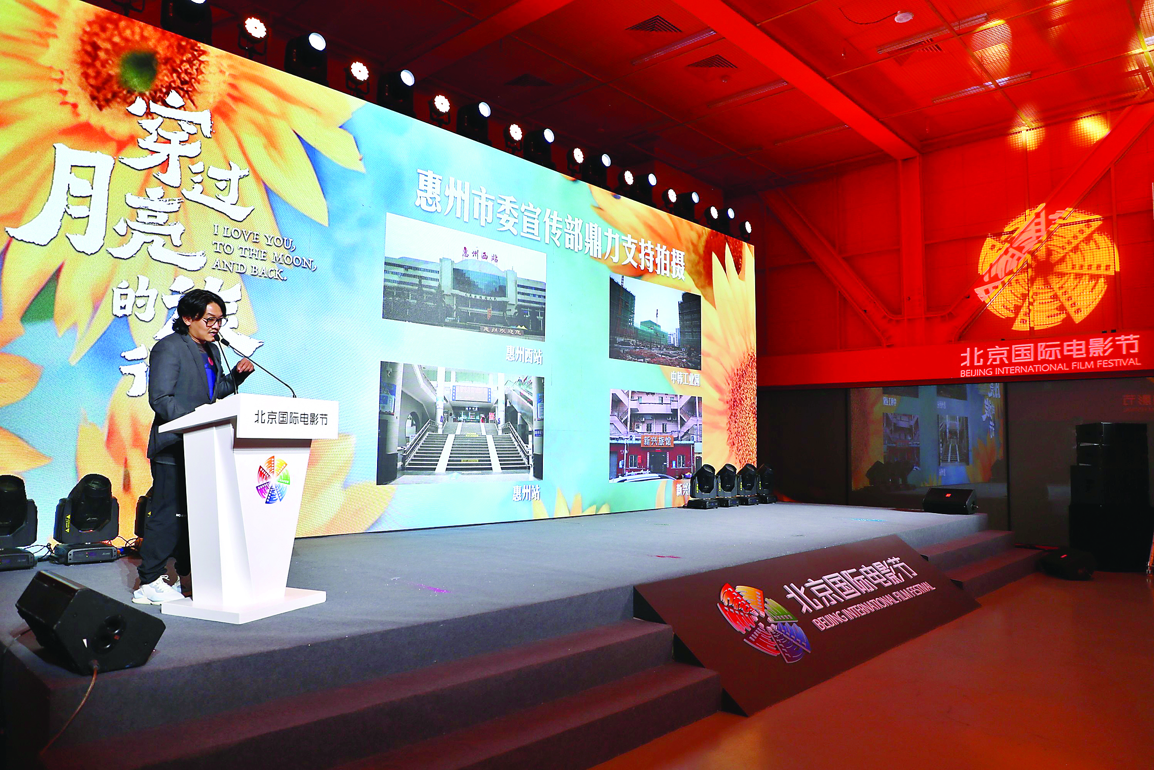 第14屆北京國(guó)際電影節(jié)現(xiàn)場(chǎng),電影《穿過(guò)月亮的旅行》總制片人張宇在推介電影和惠州。圖片由市委宣傳部提供