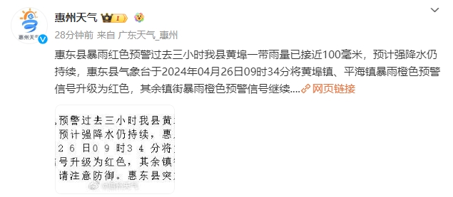 惠東縣暴雨紅色預(yù)警。過去三小時惠東縣黃埠一帶雨量已接近100毫米,預(yù)計強降水仍持續(xù),惠東縣氣象臺于2024年04月26日09時34分將黃埠鎮(zhèn)、平海鎮(zhèn)暴雨橙色預(yù)警信號升級為紅色,其余鎮(zhèn)街暴雨橙色預(yù)警信號繼續(xù)生效。