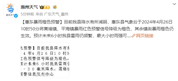 【惠陽暴雨橙色預(yù)警】目前我區(qū)降水有所減弱,惠陽區(qū)氣象臺4月26日10時33分將暴雨紅色預(yù)警信號降級為暴雨橙色。預(yù)計未來3小時我區(qū)仍有小時雨強20-30毫米降水,需注意防御。惠陽區(qū)突發(fā)事件預(yù)警信息發(fā)布中心