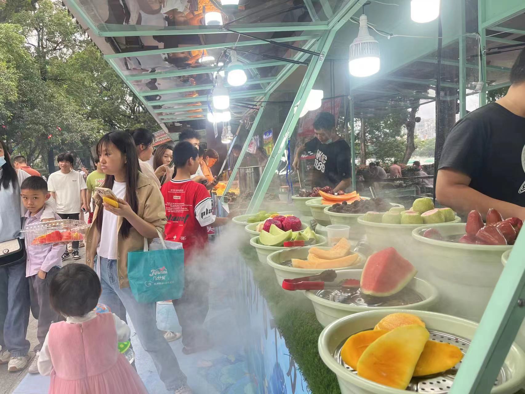 市民游客在“東坡市集”攤位前品嘗購買水果。