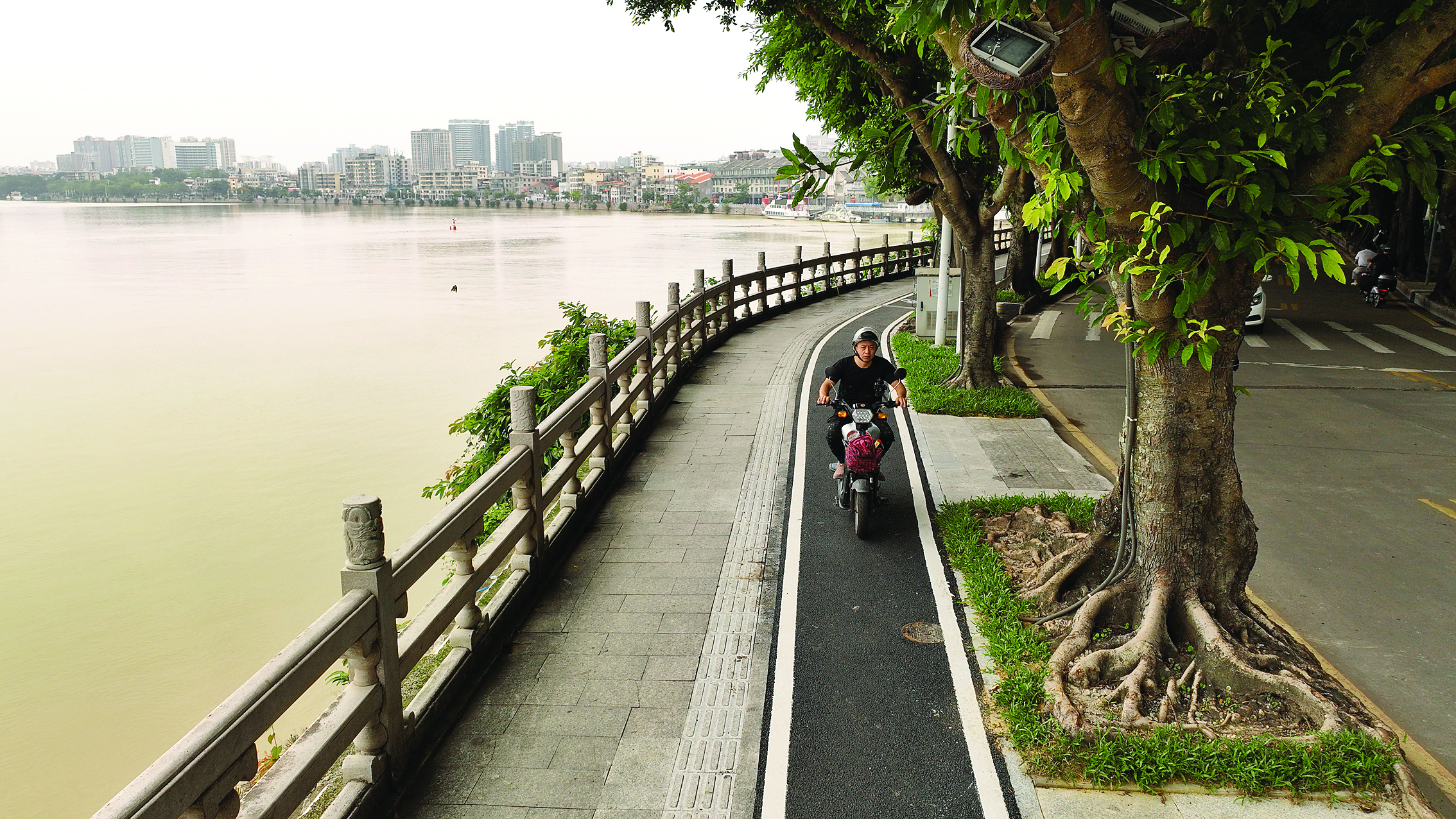 惠州市區(qū)濱江西路慢行道改造工程完工后,非機(jī)動(dòng)車、行人、機(jī)動(dòng)車各行其道。 惠州日報(bào)記者鐘暢新 攝