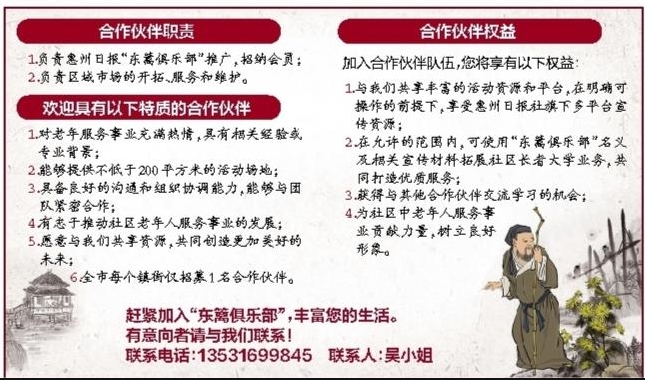 趕緊成為惠州日報社“東籬俱樂部”的合伙人,一起搶灘數(shù)十萬億規(guī)模的老年群體市場。
