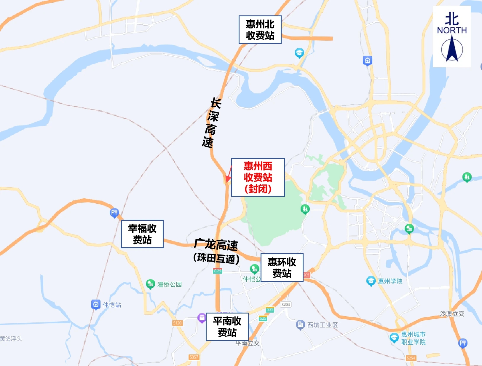 臨時交通管制期間,此前長深高速往返惠州選擇惠州西收費站通行的車輛,請選擇就近的惠州北收費站或平南收費站上下高速;或經(jīng)珠田互通轉(zhuǎn)廣龍高速,從幸福收費站或惠環(huán)收費站上下高速。