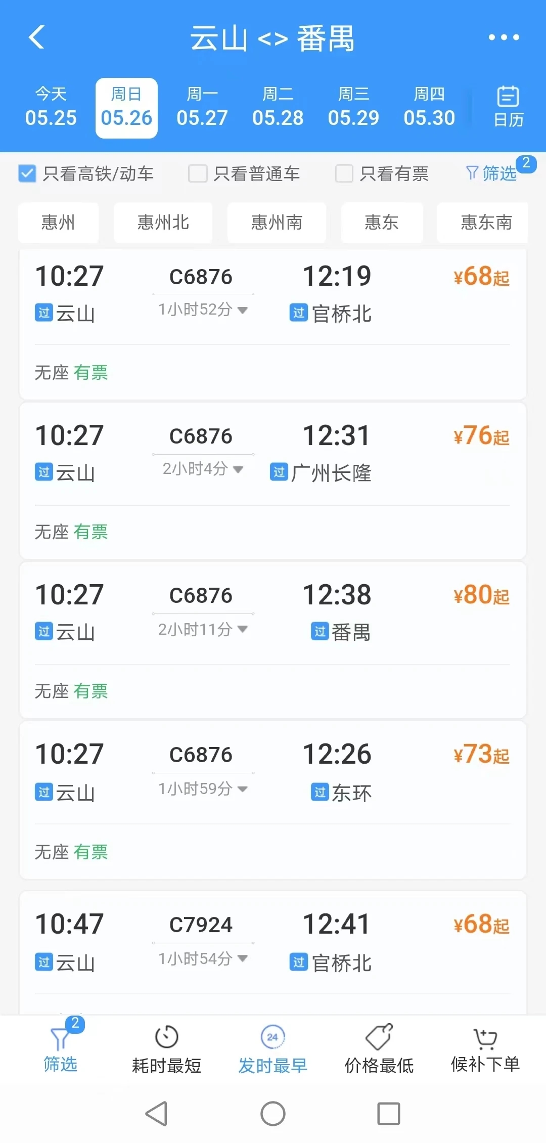 惠州西湖東站到廣州長(zhǎng)隆站用時(shí)最快1小時(shí)15分