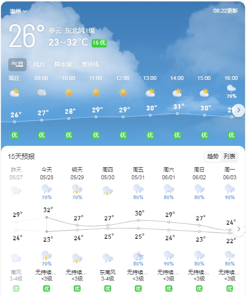 “未來一周我市降雨較頻繁,部分時段雨勢較大,并伴有短時強(qiáng)降水、雷雨大風(fēng)等強(qiáng)對流天氣。”市氣象臺預(yù)報:周二白天至周三,陰天到多云有雷陣雨,氣溫22~30℃;周四,有雷陣雨局部大雨,氣溫23~27℃;周五,有中到大雨局部暴雨,氣溫24~28℃;周六至周日,有大雨到暴雨,氣溫25~28℃。
