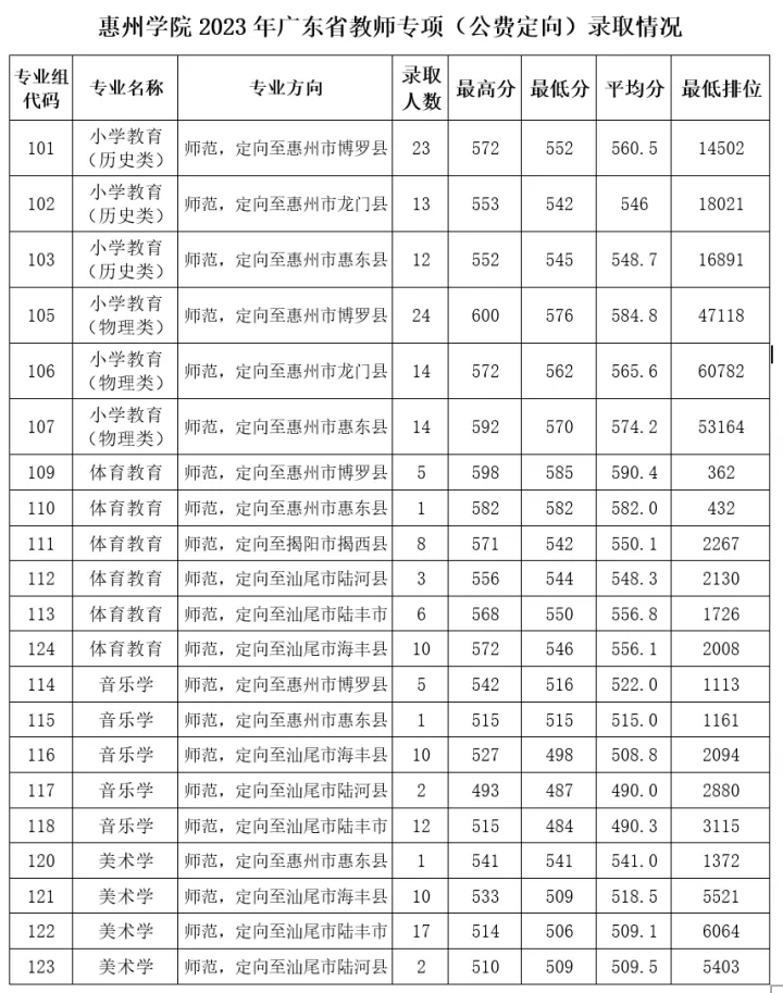 在本科提前批錄取,對(duì)達(dá)到或超過省劃定的公費(fèi)定向培養(yǎng)教師專項(xiàng)計(jì)劃錄取最低分?jǐn)?shù)線的考生,省招生辦公室按照平行志愿投檔原則,根據(jù)考生所填報(bào)專業(yè)志愿組按考生投檔總分排位情況從高分到低分進(jìn)行投檔。惠州學(xué)院對(duì)投檔考生實(shí)行“分?jǐn)?shù)優(yōu)先”錄取原則,根據(jù)考生所填報(bào)專業(yè)按考生投檔總分排位情況從高到低錄取。