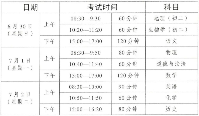 2024年省統(tǒng)一命題地市的初中學業(yè)水平語文、數(shù)學、英語、道德與法治、歷史、地理、物理、化學和生物學等科目考試時間安排如下: