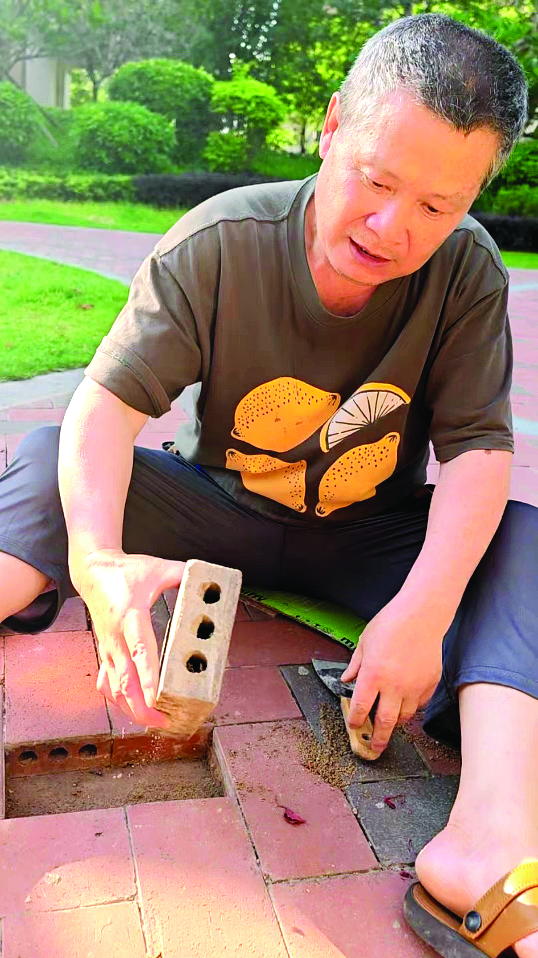 記者了解到,劉叔是居住在該小區(qū)里的居民。此前他聽到鄰居議論,小區(qū)磚塊松動(dòng)有時(shí)會(huì)絆倒小孩,雨天時(shí)鄰居踩在松動(dòng)磚塊上還時(shí)不時(shí)被底下藏著的泥水濺一身,劉叔聽了心里不是滋味。松動(dòng)磚塊的量不是特別多且范圍不集中,這種“小工程”小區(qū)物業(yè)就算找修理工人也不一定愿意來(lái)。劉叔當(dāng)即決定自己動(dòng)手修理松動(dòng)磚塊。他跟小區(qū)附近的裝修公司“討來(lái)”一些水泥,自己調(diào)和成半干濕的水泥漿,把松動(dòng)磚塊小心翼翼撬開,把多余的沙子清理后,再把磚塊壓緊,然后用半干濕水泥填好縫固定。等水泥全干后,磚塊就變牢固了。