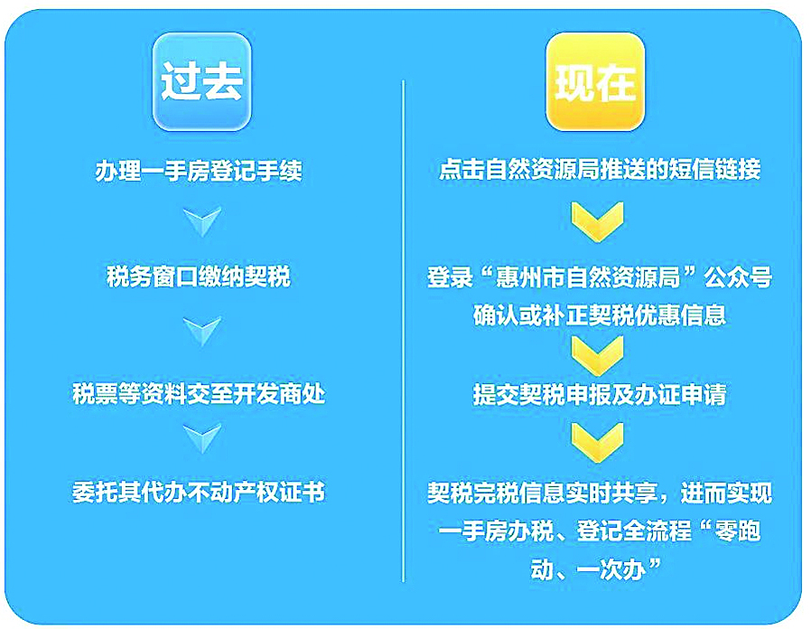 惠州市一手房辦稅辦證流程對(duì)比圖。 來(lái)源:惠州市稅務(wù)局