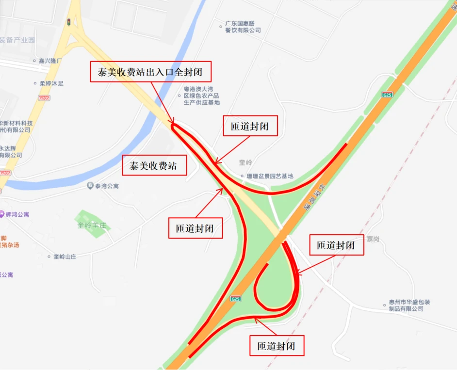 6月3日,惠州市公安局交警支隊(duì)發(fā)布《關(guān)于G25長深高速公路惠州段泰美收費(fèi)站施工期間實(shí)施交通管制的通告》。6月7日12:00至10月31日12:00,長深高速公路惠州段(惠河高速公路)泰美收費(fèi)站進(jìn)、出口匝道全部封閉,禁止車輛通行。