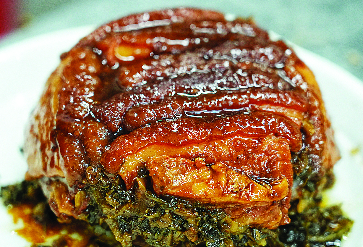 將五花肉煮透,加老抽炸上色,切成肉片盛入碗里,上鋪梅菜段,倒入原湯蒸透。半小時后,一道肉爛味香、咸中帶甜、肥而不膩的梅菜扣肉就可以上桌了。2011年,梅菜扣肉與東坡肉等四種客家菜式組合成的“東江客家菜制作技藝”,被列入惠州市級非物質(zhì)文化遺產(chǎn)名錄。