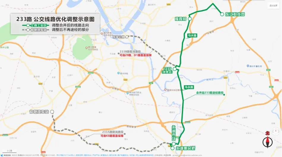 線路調整:取消233A路仲愷汽車站至永湖段及233B路東平公園至馬安路口段。2條公交線路合并,改由東江科技園始發(fā),經東新大道、惠澤大道、馬水公路、惠州大道、長安街、泰安路、馬永公路、S357省道、老惠淡路至永湖老橋。