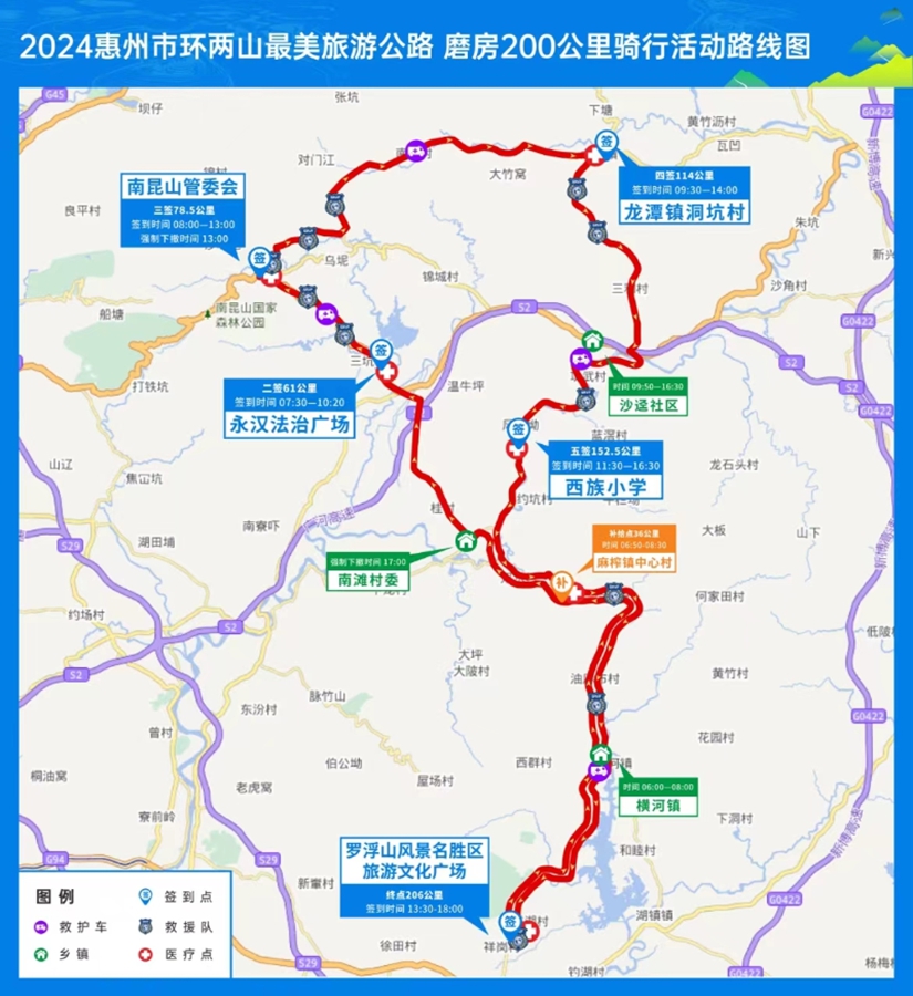 因雨延期的2024惠州市環(huán)兩山(羅浮山、南昆山)騎行活動,現(xiàn)改于6月16日舉辦。為確保比賽期間我市道路交通安全、有序、暢通,惠州市公安局交通警察支隊將分時、分段對博羅、龍門縣部分道路實施臨時交通管制。根據(jù)《中華人民共和國道路交通安全法》第三十九條的規(guī)定,現(xiàn)將活動路線及相應交通管制措施通告如下: