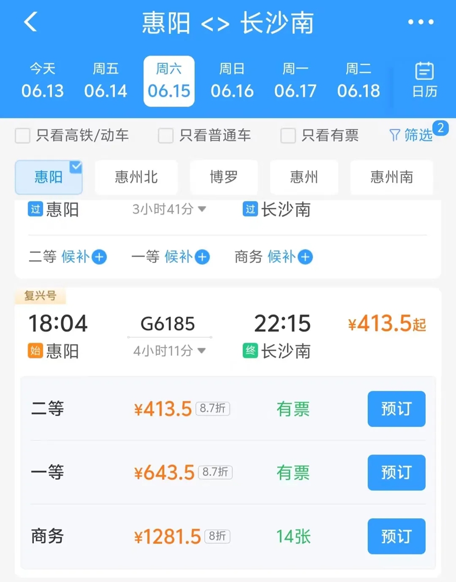 據(jù)介紹,此次調(diào)圖,惠陽站首次開行往長沙南方向始發(fā)列車,車次為G6185/4 次,該次列車于18:04從惠陽站始發(fā),途中先后在深圳坪山、深圳北、虎門、廣州南、韶關(guān)、樂昌東、郴州西等7個(gè)站點(diǎn)停靠,22:15抵達(dá)終點(diǎn)站長沙南。據(jù)12306APP顯示,始發(fā)惠陽站、終點(diǎn)長沙南站車次的二等票價(jià)為413.5元。