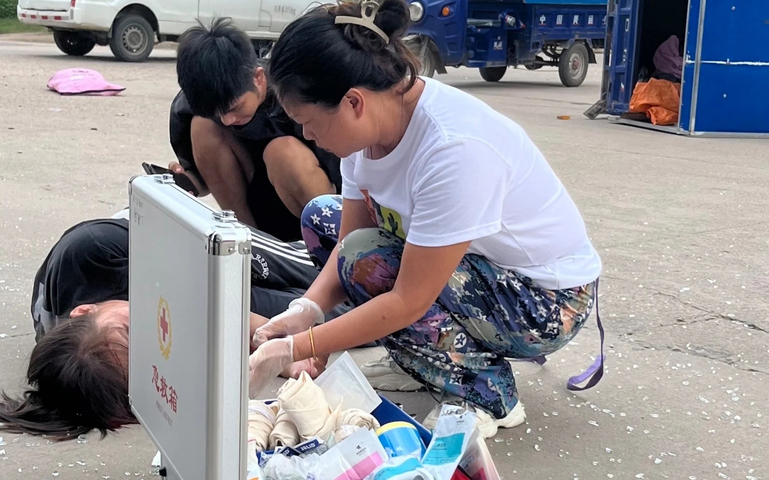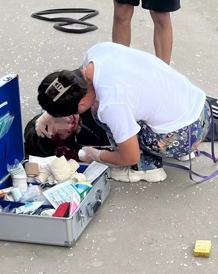 當(dāng)時(shí),一位女士被一輛小汽車撞倒在地,肇事車輛玻璃碎片散落一地,傷者遭到猛烈撞擊導(dǎo)致頭部和嘴角大量出血。胡萍駕車途經(jīng)時(shí)目睹了整個(gè)車禍過程。情況緊急,她立刻將車輛停靠在路邊,從車上取出急救箱,跑到傷者身邊,亮明紅十字救護(hù)員身份后立即對(duì)其展開急救。