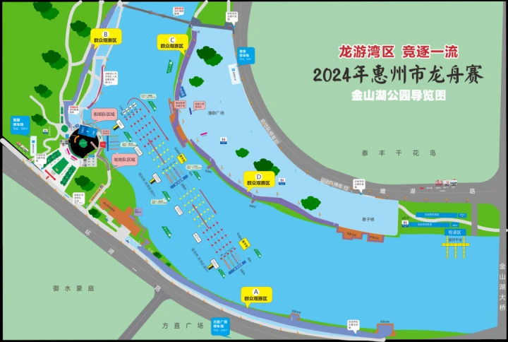本次惠州市龍舟賽將在金山湖公園內(nèi),方直廣場(chǎng)前方湖面舉行,市民在湖岸兩邊均可觀賽。