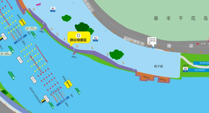 觀賽區(qū)看點(diǎn):位于賽道起點(diǎn)處,可看到比賽發(fā)令龍舟起跑瞬間及比賽前期爭(zhēng)相向前的場(chǎng)景。