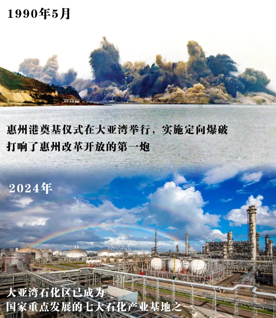 上圖:1990年5月,惠州港實(shí)施了建港大爆破,原先矗立在大亞灣海邊的石坳島被削平,一塊巨大的新陸地取代了原先長(zhǎng)500米、寬400多米的海峽。它打響了石化城建設(shè)的第一炮,也打響了惠州改革開(kāi)放的第一聲“春雷”。