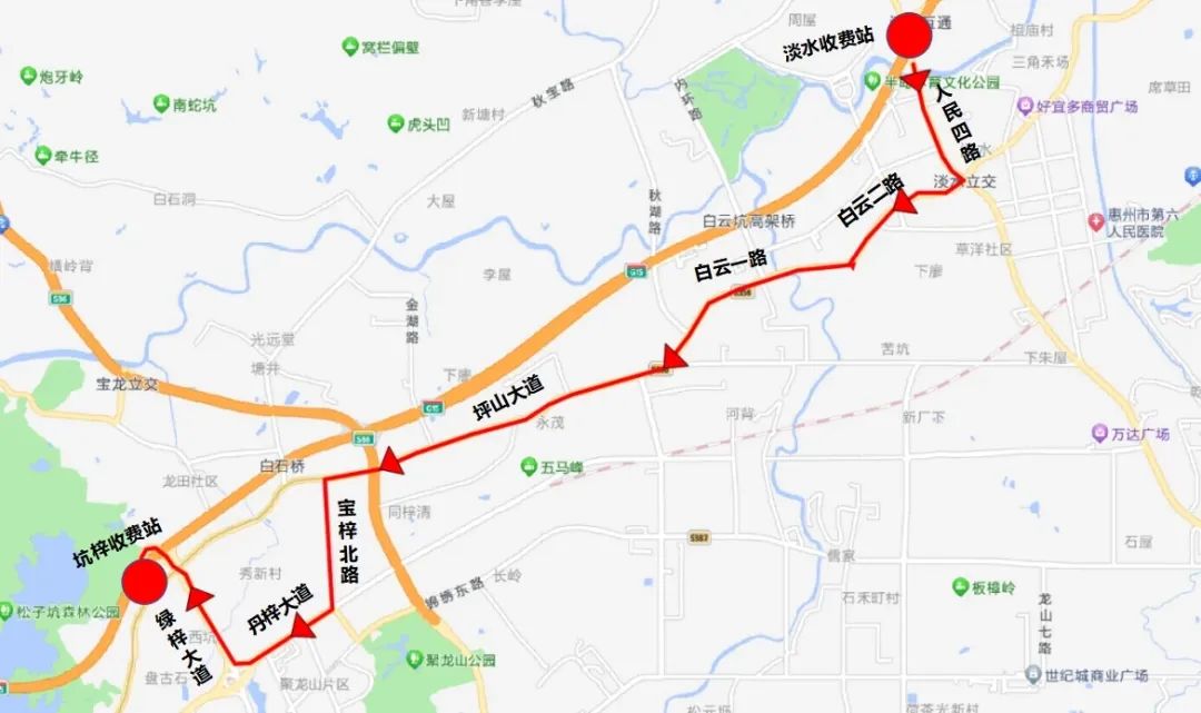 期間,原經(jīng)淡水收費(fèi)站深圳方向上行匝道上高速的車輛,可繞行人民四路→白云二路→白云一路→坪山大道→寶梓北路→丹梓大道→綠梓大道→坑梓收費(fèi)站上高速。