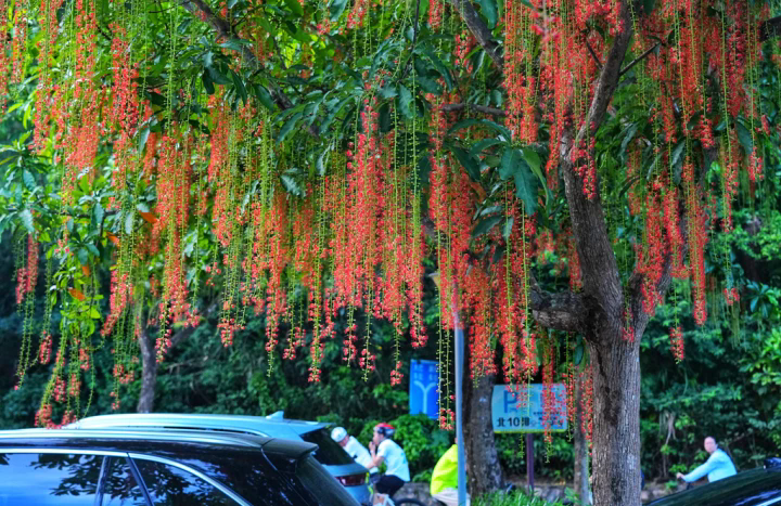 近日,惠州市紅花湖景區(qū)里90多棵紅花玉蕊盛開了,紅花玉蕊株形美觀,葉大常綠,花序下垂,長可達(dá)半米,花色深紅,遠(yuǎn)觀如一條條紅綢帶系于枝頭,近看卻似一掛掛喜慶的炮仗。清晨,當(dāng)你在花玉蕊樹下,會看到滿地紅。