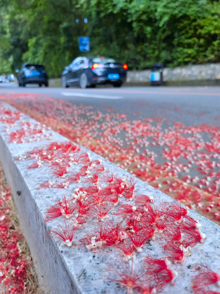 清晨,紅花玉蕊樹下滿地紅。