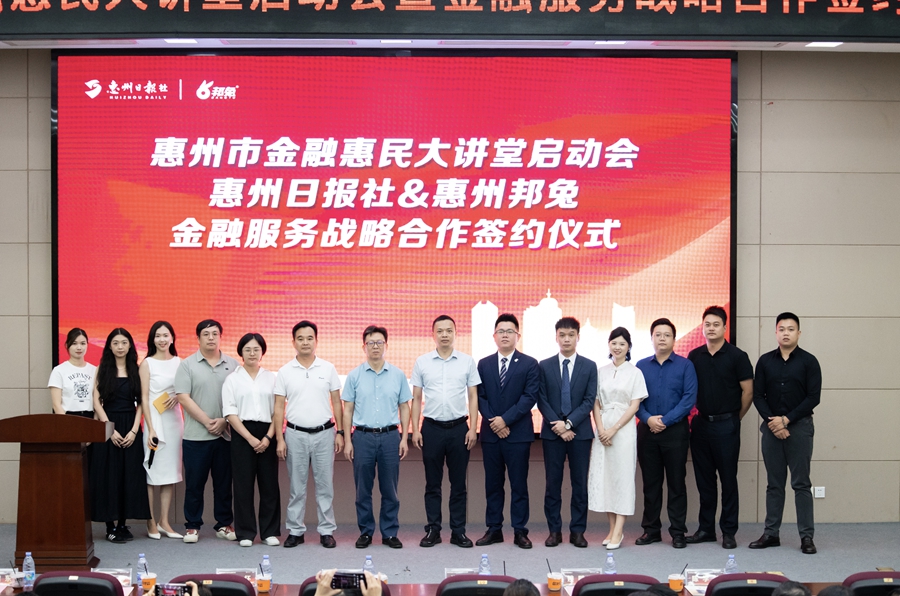 7月7日,惠州市金融惠民大講堂啟動會暨惠州日報社與惠州邦兔金融服務戰(zhàn)略合作簽約儀式在惠州日報社隆重舉行。惠州日報社、惠州市銀行業(yè)協會、惠州市保險行業(yè)協會、惠州市金融消費權益保護聯合會、惠州市邦兔信息咨詢有限公司相關負責人齊聚一堂,共同見證這一重要時刻。