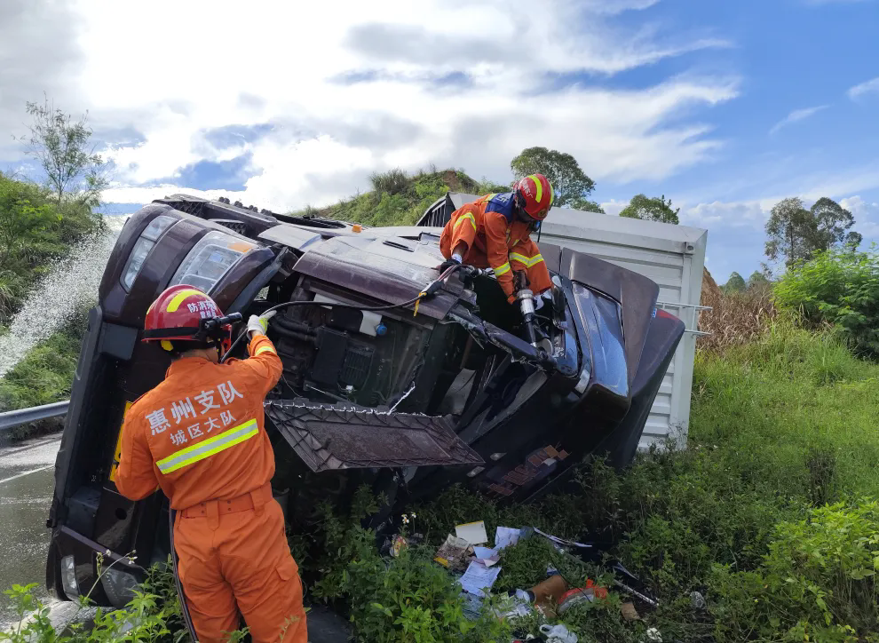 一貨車側(cè)翻致2人被困