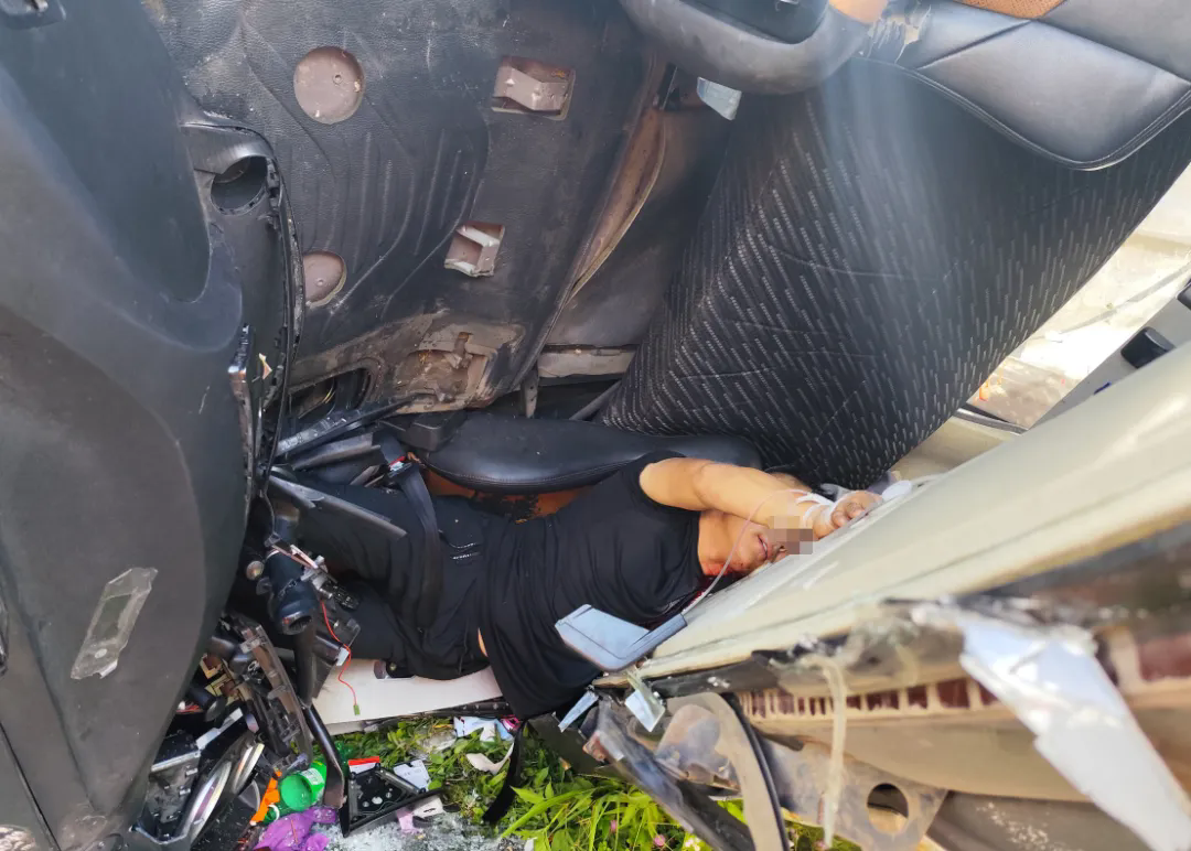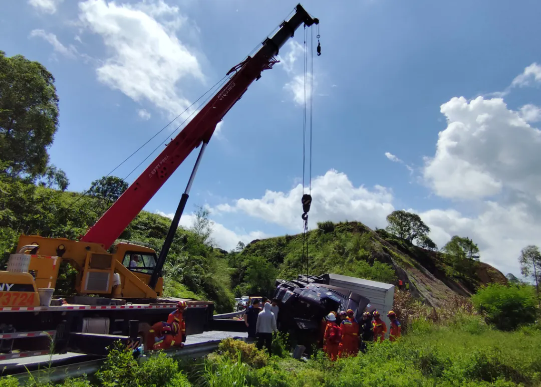 救援人員立即出水對(duì)漏油稀釋防止起火,同時(shí)采用破拆、擴(kuò)張裝備開辟救生道路。由于車輛駕駛室嚴(yán)重變形導(dǎo)致破拆困難,高速交警根據(jù)現(xiàn)場(chǎng)情況溝通調(diào)派一輛吊車到場(chǎng),吊車通過不同點(diǎn)位牽引車頭,配合消防救援人員破拆救援。