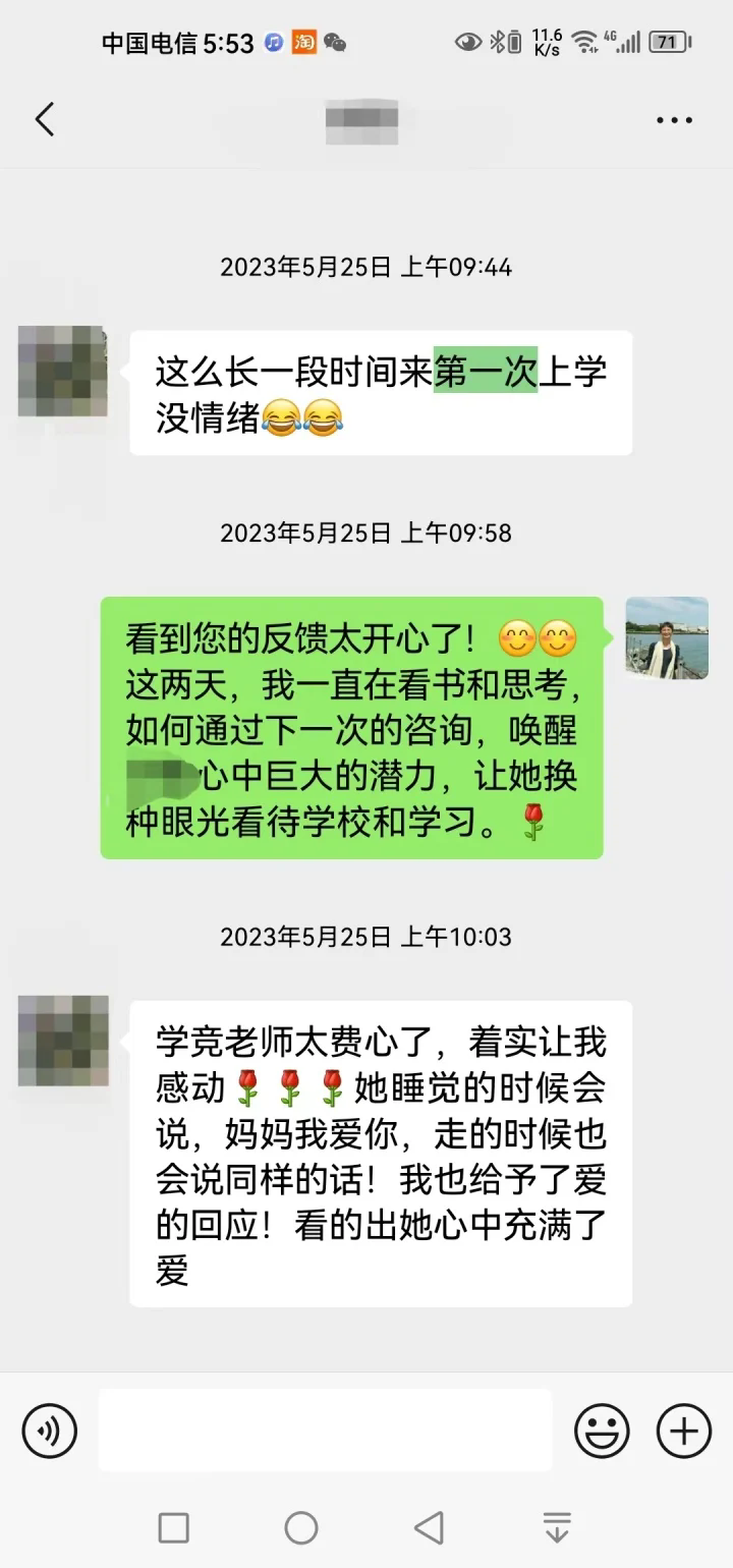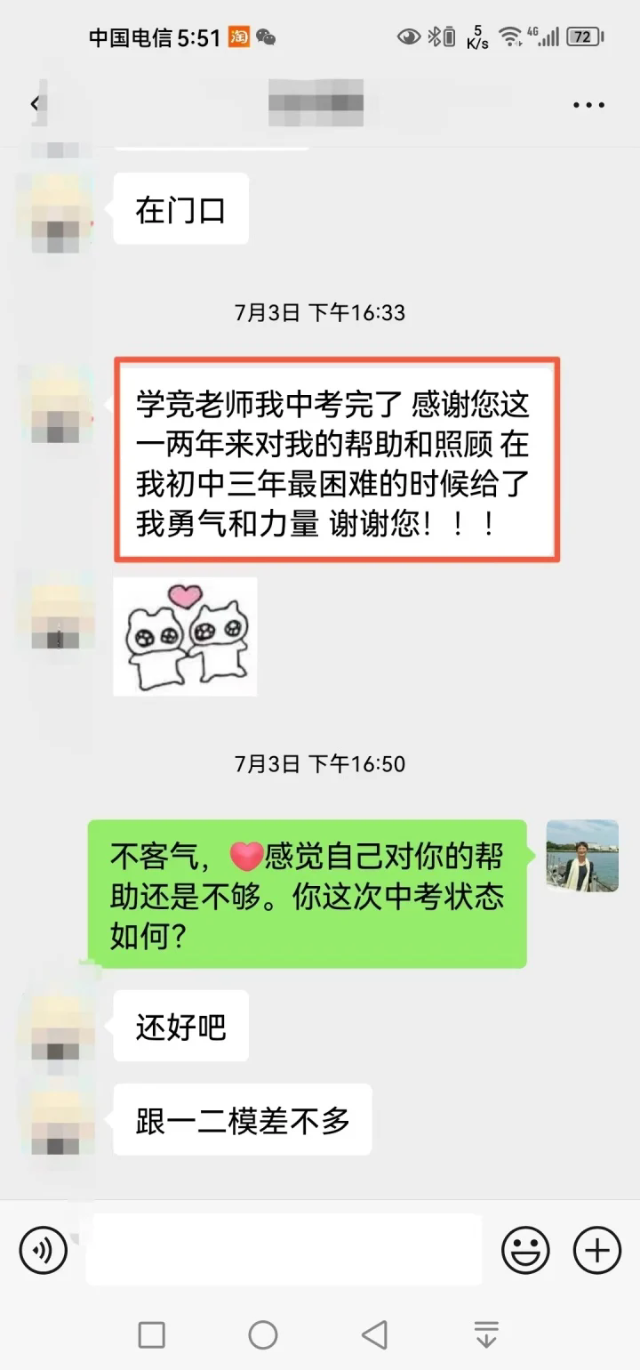 去年12月后,學競因為工作很忙,讓沁和沁媽去自我成長,她們一直努力向前走著。不久前中考結(jié)束后,就有了文章開頭的一幕。當學競肯定了沁媽的付出后,沁媽回復道:“我們只能做好自己能做的,關(guān)鍵還是她自己的努力與堅持!這一路走來真的不容易,關(guān)鍵時刻特別感謝有您的幫助與指導!愛你,感恩遇見!”