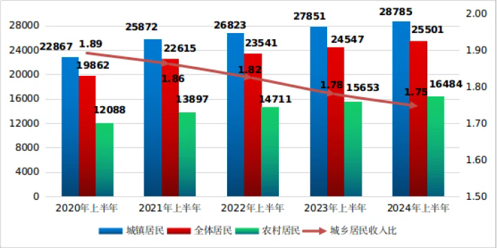 分城鄉(xiāng)來看,上半年惠州城鎮(zhèn)居民人均可支配收入28785元,同比增長(zhǎng)3.4%;農(nóng)村居民人均可支配16484元,同比增長(zhǎng)5.3%。城鄉(xiāng)居民收入比為1.75:1,比2023年上半年降低0.03,城鄉(xiāng)居民收入比進(jìn)一步縮小。